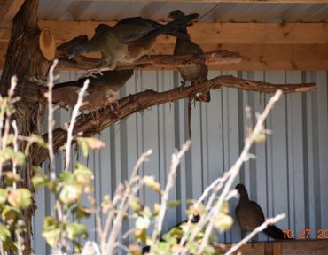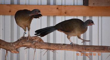 Chachalaca are the smallest of the three species of Cracids with the others being, Guan and Currosaw. The Chaco Chachalaca are indigenous to the Gran Chaco Region of South America this includes Uruguay, Paraguay, Bolivia, Argentina and Brazil. They are very curious, will readily eat almost anything you can give them, they especially like fruits. Chacos spend a large amount of time on the ground and will hurriedly run for cover when they feel threatened. They are obnoxiously loud as are most all Chachalaca birds with the male being the loudest of the genders. This is due to an evolutionary adaptation called a “tracheal loop”, the male chachalaca have an elongated trachea that hangs outside the breast and keel and curls similar to that of a trombone. Older males can have tracheal loops that extend from the breast to the vent. This adaptation gives the males a deeper and much louder call. The hens are just as vocal but not as loud and much higher in pitch. Both genders are very similar in color and markings with the males being slightly larger and at 10-12 months expect the males to have a noticeable tracheal loop developing. You must catch and feel for the loop, it is not visible or if you’re experienced in chachalaca, the vocals will let you know. Chacos are similar in size to Red Golden Pheasants.
