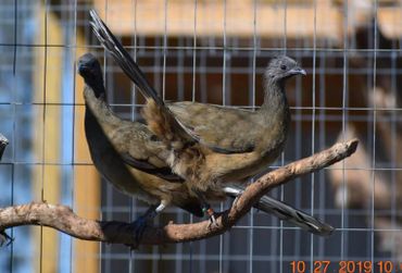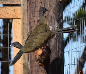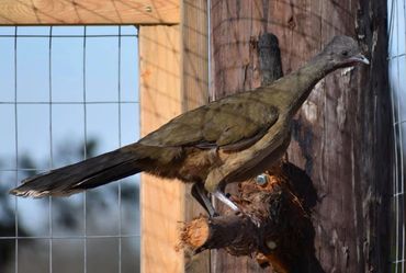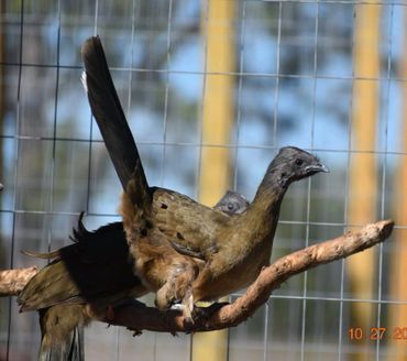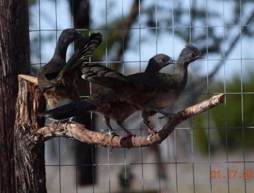 The Plain Chachalaca range from Southern Texas to Northern Costa Rica and just like their cousins the Chaco Chachalaca they are very curious, maybe even more courageous as I can get the Plains to eat from my hand. Plain Chachalaca also spend a large amount of time on the ground and will hurriedly run for cover when they feel threatened. They are obnoxiously loud as are most all Chachalaca birds with the male being the loudest of the genders. This is due to an evolutionary adaptation called a “tracheal loop”, the male chachalaca have an elongated trachea that hangs outside the breast and keel and curls similar to that of a trombone. Older males can have tracheal loops that extend from the breast to the vent. This adaptation gives the males a deeper and much louder call. The hens are just as vocal but not as loud and much higher in pitch. Both genders are very similar in color and markings with the males being slightly larger and at 10-12 months expect the males to have a noticeable tracheal loop developing. You must catch and feel for the loop, it is not visible or if you’re experienced in chachalaca, the vocals will let you know. Plain Chachalaca are smaller than Chacos and similar in size to Road Runners.